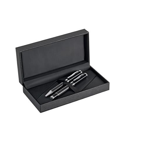 Zestaw – długopis i pióro kulkowe z metalu i włókna węglowego, oba z klipem. Zestawy mają czarny wkład, a długopis ma mechanizm obrotowy. Dostarczany w wyściełanym etui z PU. Długopis: o13 x 142 mm | Roller: o13 x 140 mm | Pudełko: 171 x 67 x 38 mm