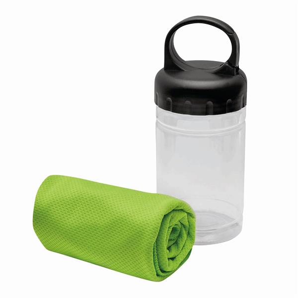 Ręcznik chłodzący CHILLING w przezroczystej puszce. Chroni przed słońcem. Przed użyciem ręcznika należy zmoczyć go wodą. Można napełnić wodą puszkę z ręcznikiem i wstrząsnąć nią. Pokrywka z czarnym karabińczykiem. Idealne rozwiązanie dla osób aktywnych.