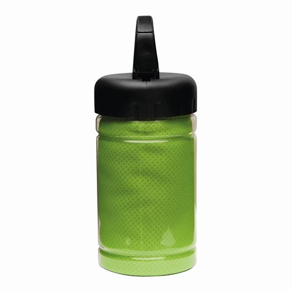 Ręcznik chłodzący CHILLING w przezroczystej puszce. Chroni przed słońcem. Przed użyciem ręcznika należy zmoczyć go wodą. Można napełnić wodą puszkę z ręcznikiem i wstrząsnąć nią. Pokrywka z czarnym karabińczykiem. Idealne rozwiązanie dla osób aktywnych. Materiał: Poliester/Plastik Kolor: zielony Tagi: Ręczniki chłodzące,fitness,artykuły sportowe,artykuły gospodarstwa domowego,artykuły rekreacyjne