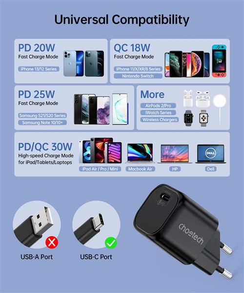 Szybka ładowarka sieciowa GaN marki Choetech wyposażona w port USB Typ C, który umożliwia ładowanie z mocą do 30W. Pozwala na szybkie ładowanie urządzeń w standardzie PD (Power Delivery). Została wyposażona w wiele zabezpieczeń takich jak np. przed przegrzaniem, przepięciem, wysokim napięciem czy przeciążeniem. Elektroniczne komponenty ładowarki zostały wykonane w technologii GaN czyli są oparte na azotku galu, a nie na krzemie. GaN to lepsza efektywność pracy i mniejsze zużycie energii.