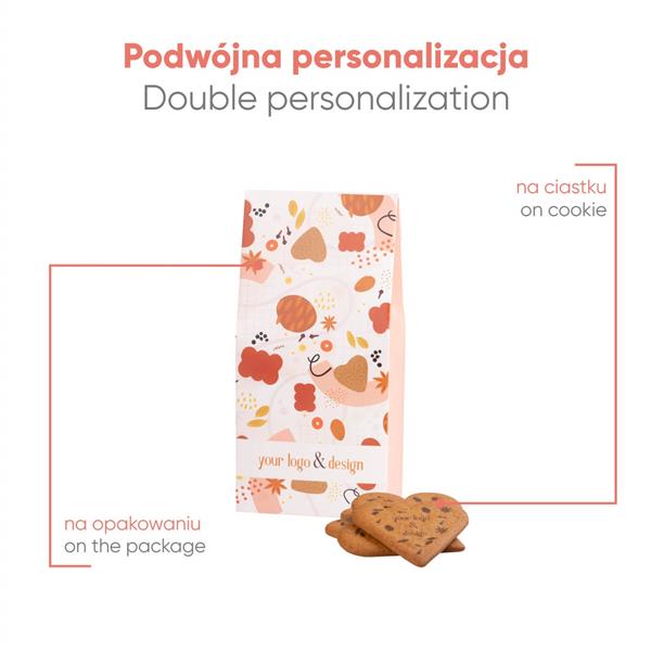 Ciastka możemy poddać personalizacji i umieścić na nich Twój logotyp lub grafikę full color. Każde z nich również osobno pakujemy w folię kompostowalną, aby jak najdłużej zachować ich świeżość. Następnie serduszka trafiają do papierowej stojącej torebki, którą możemy dowolnie spersonalizować, zapewniając Twojej marce naprawdę okazałą powierzchnię reklamową.