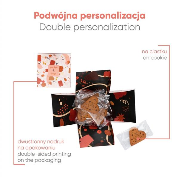 W tym produkcie możesz spersonalizować ciasteczko oraz opakowanie – dwustronnie, dzięki czemu otrzymujesz naprawdę dużą powierzchnię reklamową.