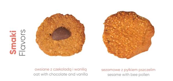 Proponujemy cztery smaki do wyboru – owsiane z czekoladą i wanilią (produkt wegański), sezamowe z pyłkiem pszczelim (produkt wegetariański), sezamowe z żurawiną (produkt wegetariański) i migdałowe ze skórką cytryny i cynamonem (produkt wegański).
