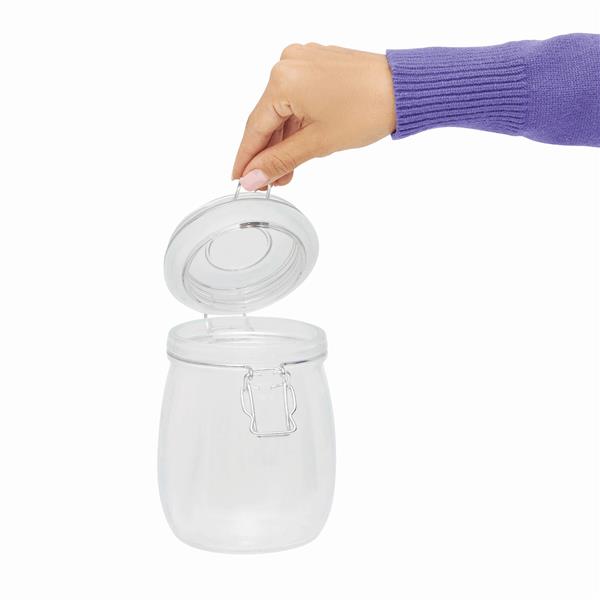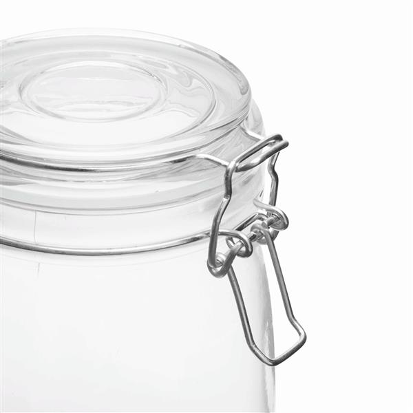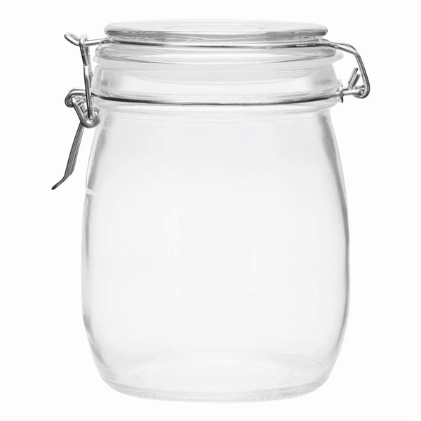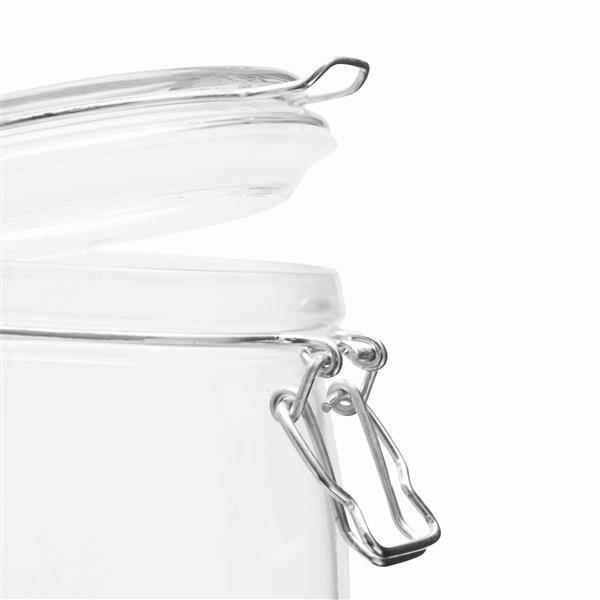 Szklany słoik CLICKY L z uchylnym wieczkiem i białą, silikonową uszczelką. Do robienia przetworów, marynowania warzyw lub przechowywania żywności. Ze zmontowaną pokrywką. Łatwo się otwiera i zamyka. Pojemność ok. 750 ml.