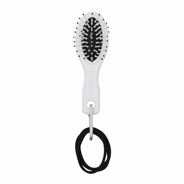 Szczotka do włosów COIFFEUR z aluminiowym karabińczykiem, dołączone 3 gumki do włosów. Materiał: Plastik/Guma Kolor: biały, czarny Tagi: artykuły gospodarstwa domowego,pielęgnacja włosów