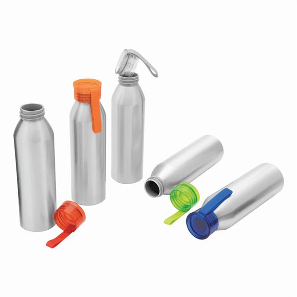 Aluminiowa butelka COLOURED z kolorową plastikową zakrętką i silikonowym paskiem do przenoszenia, pojemność ok. 650 ml.