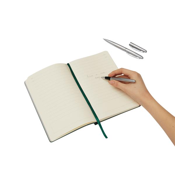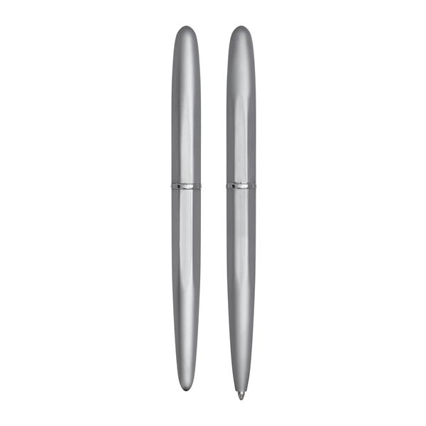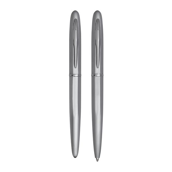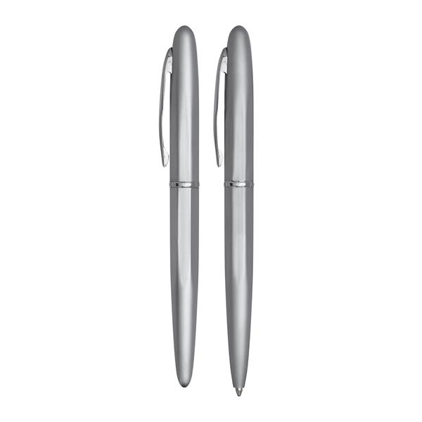 Zestaw do pisania COMTESSE zawiera długopis z obracaną obsadką i pióro kulkowego. Wykonane z trwałego, satynowego metalu z kontrastującymi chromowanymi elementami.