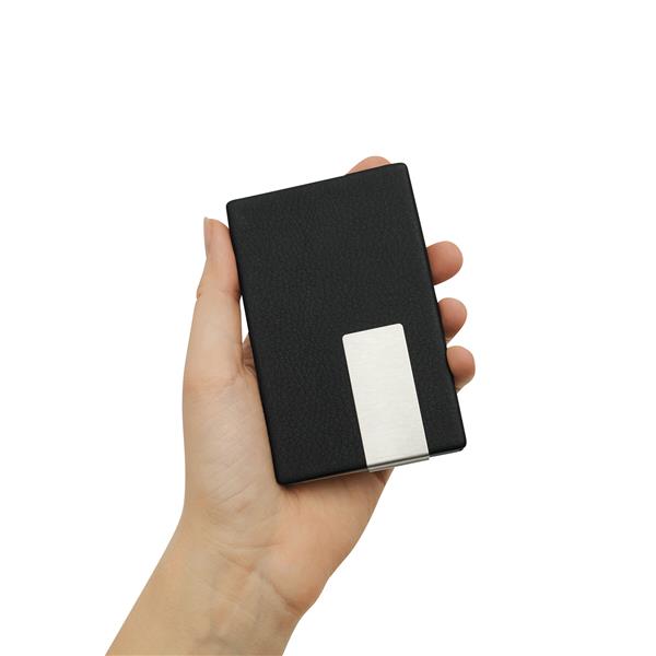 Etui na wizytówki COOL CARDS wykonane ze skóry, ze wstawką z metalu. Materiał: Aluminium/PU Kolor: czarny, srebrny Tagi: Etui na wizytówki,akcesoria biurowe,akcesoria podróżne