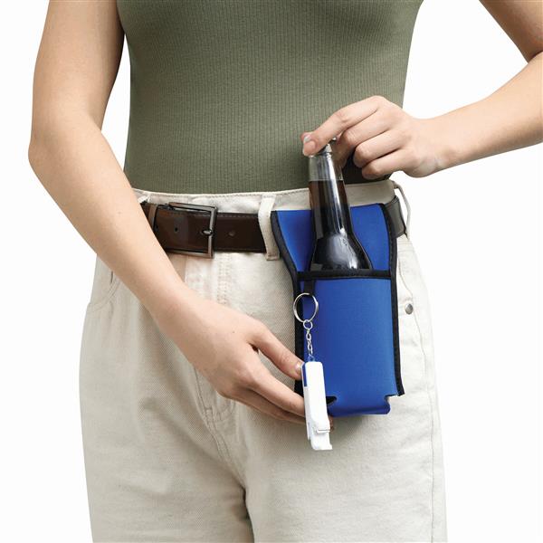 Uchwyt na butelkę COOL HIKING o wyglądzie neoprenu, odpowiedni do butelek i puszek o średnicy ok. 7 cm. Rzep do zamocowania na pasku, kierownicy roweru lub wózku dziecięcym. Dodatkowa pętelka do przyczepienia otwieracza (nie załączony) lub kluczy. Dobrze wyeksponowana powierzchnia na nadruk.