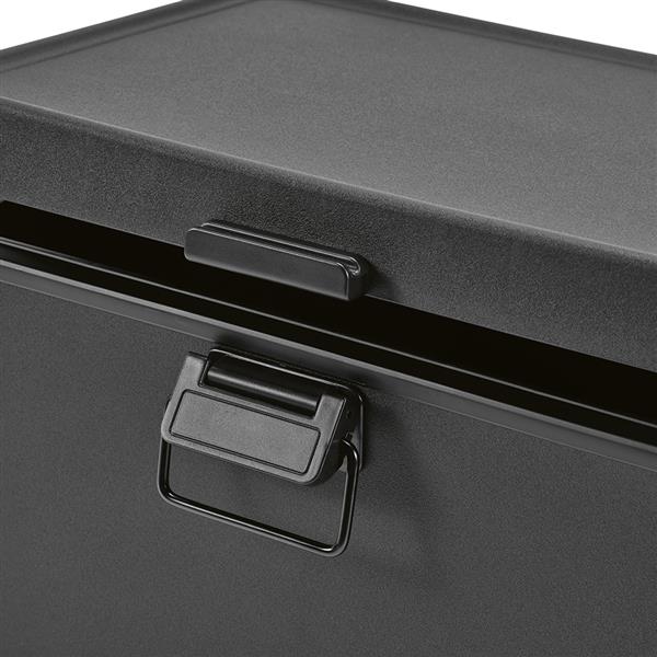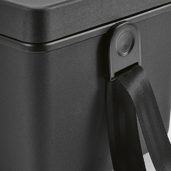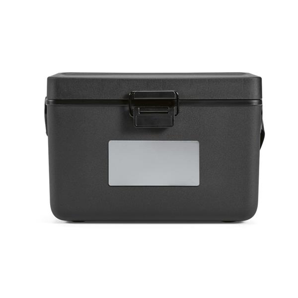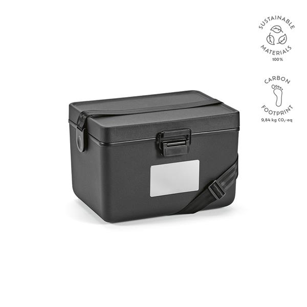Plastikowa lodówka 12L z recyklingu: Trwała, przyjazna dla środowiska, z poręcznym paskiem transportowym. Dostarczana z tabliczką (14 x 7 cm), na której można umieścić logo. Idealny do chłodzenia napojów w podróży, podczas biwakowania lub na plaży.