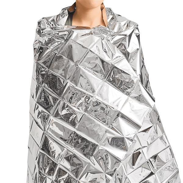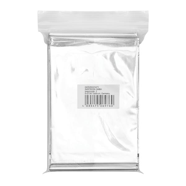 Koc termoizolacyjny COVERING UP z cienkiej poliestrowej folii (PET) pokrytej aluminium. Przydatny podczas pierwszej pomocy. Chroni przed utratą ciepła oraz przed gorącem.