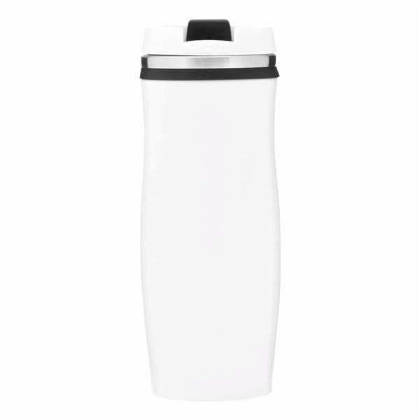 Kubek termiczny CREMA ze stali nierdzewnej wewnątrz i na zewnątrz. Z odkręcaną plastikową pokrywą i wbudowanym, składanym otworem do picia. Kolorowa guma wokół otworu, gumowany spód, pojemność ok. 400 ml.