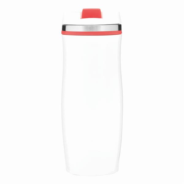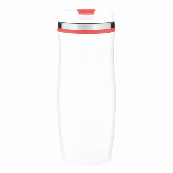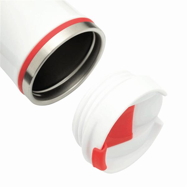 Kubek termiczny CREMA ze stali nierdzewnej wewnątrz i na zewnątrz. Z odkręcaną plastikową pokrywą i wbudowanym, składanym otworem do picia. Kolorowa guma wokół otworu, gumowany spód, pojemność ok. 400 ml.