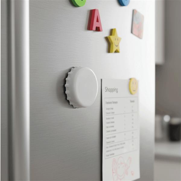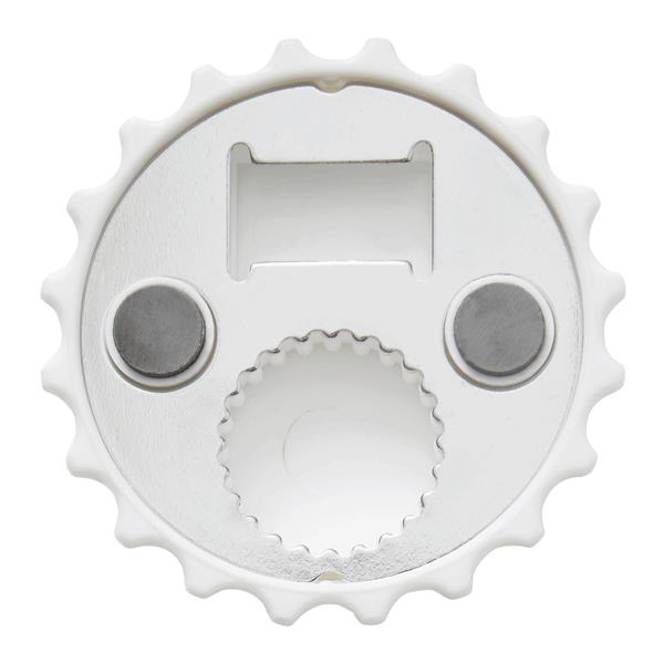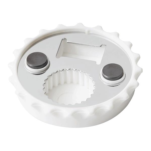 Otwieracz do butelek CROWNCAP. Nadaje się on zarówno do kapsli, jak i metalowych nakrętek. Wyposażony jest w dwa magnesy umożliwiające przymocowanie np. do lodówki.