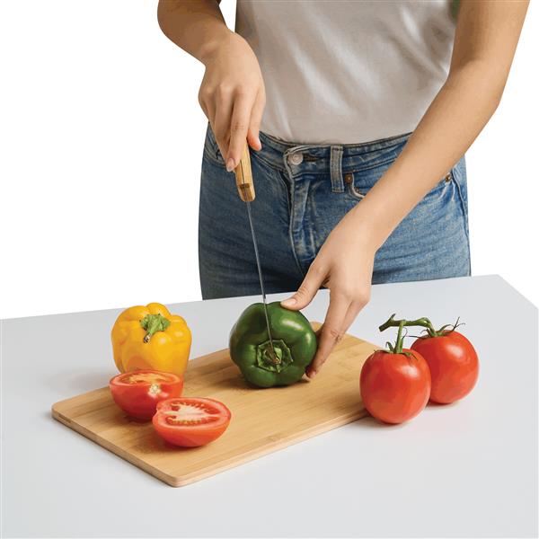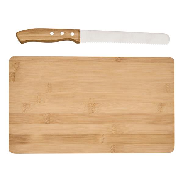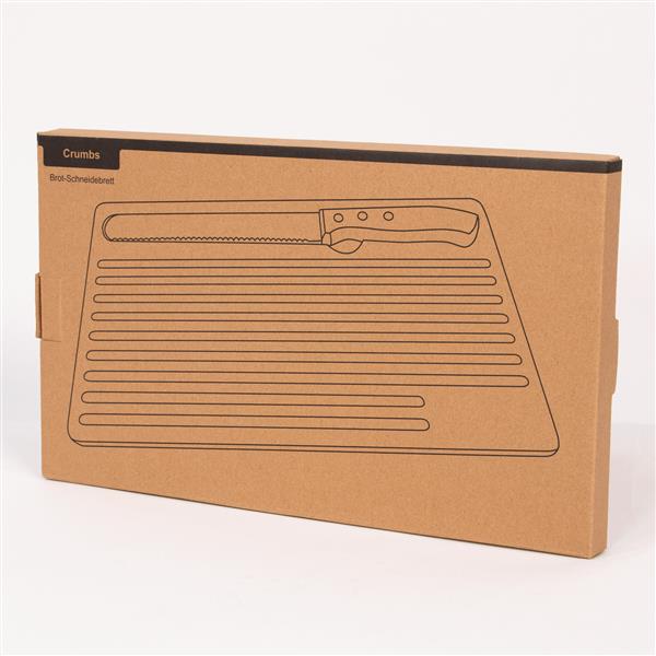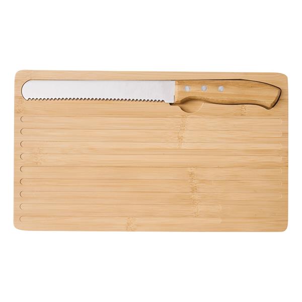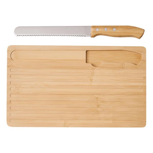 Bambusowa deska do krojenia CRUMBS W zestawie zawiera nóż do chleba z ostrzem ze stali nierdzewnej i bambusową rączką. Nóż idealnie mieści się we wgłębieniu.