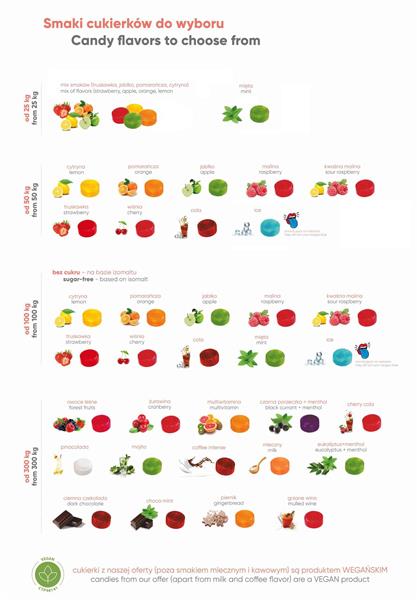 Polecamy też soczyście owocowy wariant – cukierki z dodatkiem soków owocowych. Dostępne są w 4 wersjach smakowych: jabłko, truskawka, pomarańcza i cytryna. Ich kolor i smak to zasługa naturalnych soków owocowych.