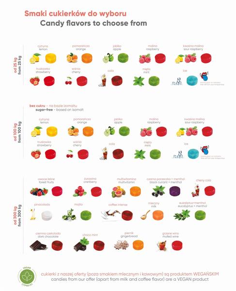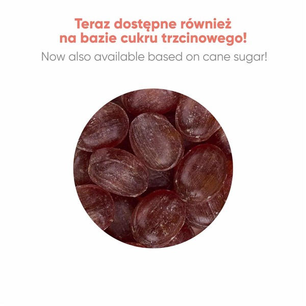 Polecamy też soczyście owocowy wariant – cukierki z dodatkiem soków owocowych. Dostępne są w 4 wersjach smakowych: jabłko, truskawka, pomarańcza i cytryna. Ich kolor i smak to zasługa naturalnych soków owocowych.