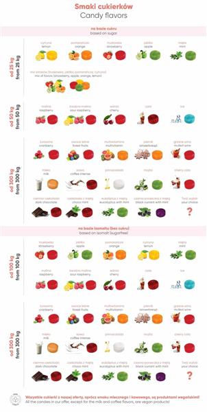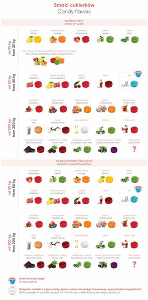 Polecamy też soczyście owocowy wariant – cukierki z dodatkiem soków owocowych. Dostępne są w 4 wersjach smakowych: jabłko, truskawka, pomarańcza i cytryna. Ich kolor i smak to zasługa naturalnych soków owocowych.