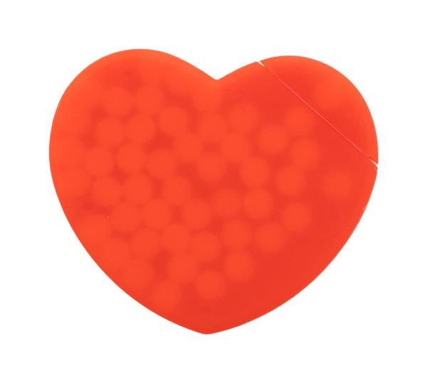 Plastikowy dozownik cukierków miętowych w kształcie serca, zawierający ok. 8 gramów cukierków miętowych bez cukru. Description: Plastikowy dozownik cukierków miętowych w kształcie serca, zawierający ok. 8 gramów cukierków miętowych bez cukru. Primary Color: czerwony Material 1: Plastik Rozmiar: 72×60×6 mm