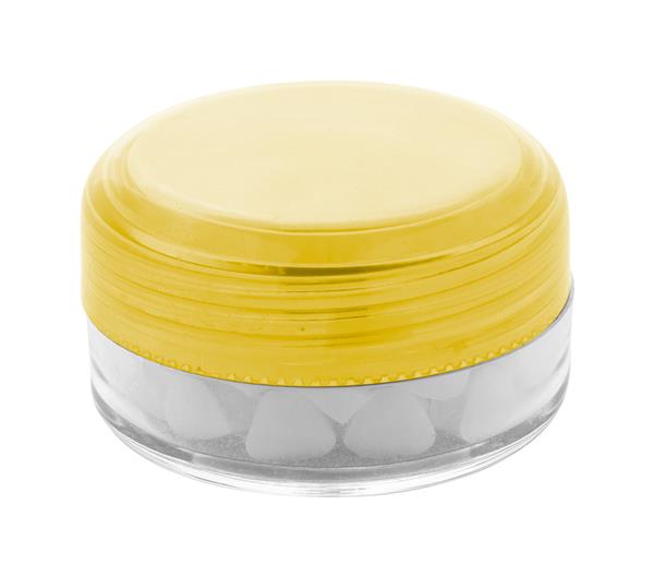 Okrągły, przezroczysty plastikowy słoik z kolorową zakrętką. Zawiera ok. 12 gramów cukierków miętowych. Description: Okrągły, przezroczysty plastikowy słoik z kolorową zakrętką. Zawiera ok. 12 gramów cukierków miętowych. Primary Color: żółty Material 1: Plastik Rozmiar: o45×25 mm