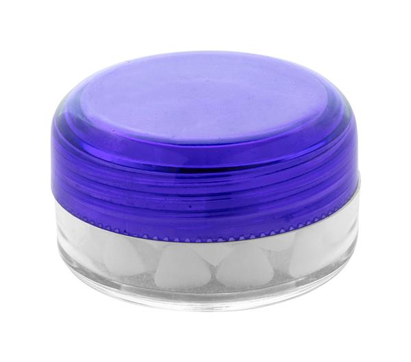 Okrągły, przezroczysty plastikowy słoik z kolorową zakrętką. Zawiera ok. 12 gramów cukierków miętowych. Description: Okrągły, przezroczysty plastikowy słoik z kolorową zakrętką. Zawiera ok. 12 gramów cukierków miętowych. Primary Color: ciemno niebieski Material 1: Plastik Rozmiar: o45×25 mm