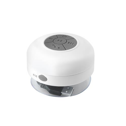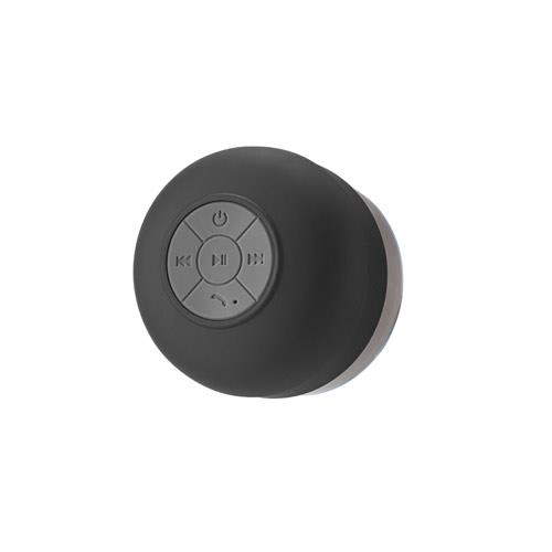 Wodoodporny głośnik wykonany z ABS z matowym wykończeniem. Głośnik bezprzewodowy, umożliwia transmisję BT. Posiada moc 3W (4?) i autonomię do 3h. Jego funkcje obejmują: odbieranie połączeń, sterowanie głośnością i łączenie się z urządzeniami. Zawiera przyssawkę i kabel do ładowania. Dostarczany w pudełku prezentowym. o85 x 50 mm | Pudełko: 88 x 88 x 55 mm
