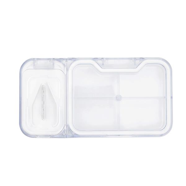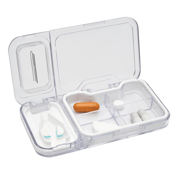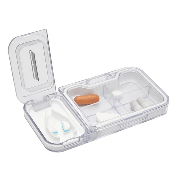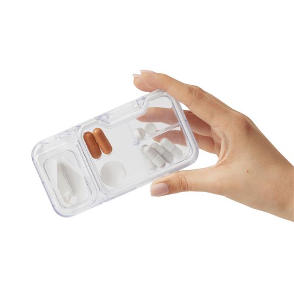 Pudełko na tabletki CUT IT. Posiada 4 oddzielne przegródki, 1 przecinak do tabletek i przezroczystą pokrywkę.
