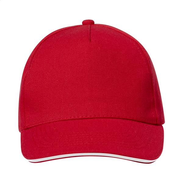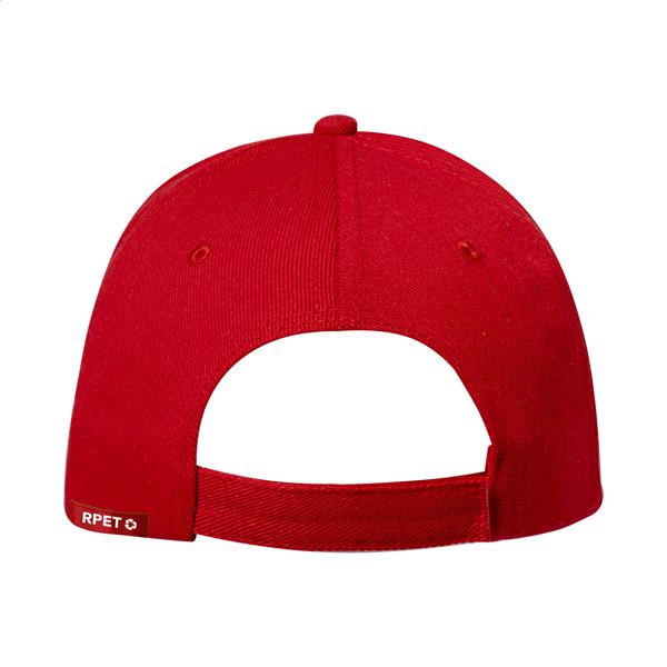 Czapka z daszkiem z poliestru RPET, pięciopanelowa i zapinana na rzep.