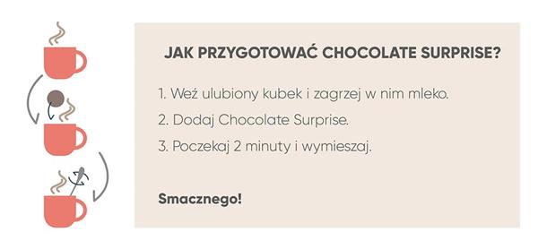 Double Chocolate Surprise to efektowna niespodzianka, czyli dwie czekoladowe kule kryjące w sobie owoce lub klasyczny dodatek do gorącej czekolady – delikatne pianki.