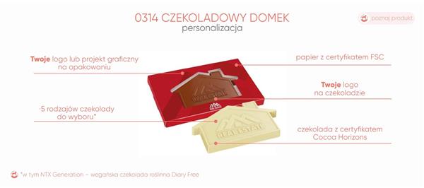 Czekolada kształtowa, umieszczona w wyprasce z R-PET (czyli PET pochodzący w 80% z recyklingu) zamknięta jest w opakowaniu z papieru z certyfikatem FSC (do wyboru kolor: biały, kraft lub ecru -papier z dodatkiem włókien trawy). Pudełko z okienkiem pozwala pięknie wyeksponować czekoladę.