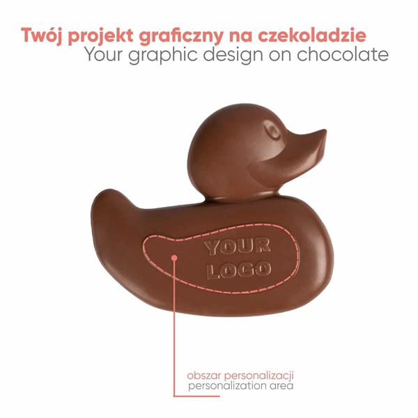 Czekolada kształtowa, umieszczona w wyprasce z R-PET (czyli PET pochodzący w 80% z recyklingu) zamknięta jest w opakowaniu z papieru z certyfikatem FSC (do wyboru kolor: biały, kraft lub ecru -papier z dodatkiem włókien trawy). Pudełko z okienkiem pozwala pięknie wyeksponować czekoladę.