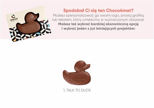 Choco4Mat to wiele opcji personalizacji – możesz nie tylko wybrać kształt czekolady reklamowej, ale także jej kuwerturę czyli smak (oferujemy aż 10 do wyboru), wyeksponować logo bezpośrednio na produkcie oraz spersonalizować grafikę opakowania. Dzięki temu stworzysz niepowtarzalny słodki gadżet reklamowy jakości premium, dopasowany do marki, branży oraz założeń kampanii promocyjnej.