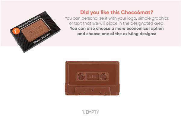 Choco4Mat to wiele opcji personalizacji – możesz nie tylko wybrać kształt czekolady, ale także jej kuwerturę czyli smak (oferujemy aż 10 do wyboru), wyeksponować logo bezpośrednio na produkcie oraz spersonalizować grafikę opakowania. Dzięki temu stworzysz niepowtarzalny słodki gadżet reklamowy jakości premium, dopasowany do marki, branży oraz założeń kampanii promocyjnej.