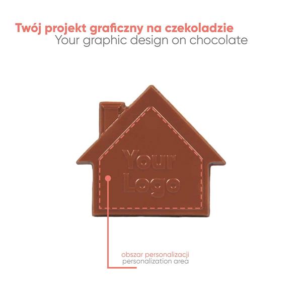 Czekoladowy Kształt CHOCO4MAT Mini Domek z wizytówką to oryginalny produkt o wadze 30 g, dostępny w wielu smakach – od białej i mlecznej, przez deserową z różnym procentem kakao, aż po innowacyjne wersje bez cukru i roślinne. Każdy domek wyposażony jest w miejsce na wizytówkę oraz opcję personalizacji opakowania i samej czekolady poprzez tłoczenie. Wypraska wykonana jest z ekologicznego materiału R-PET, co podkreśla dbałość o środowisko.