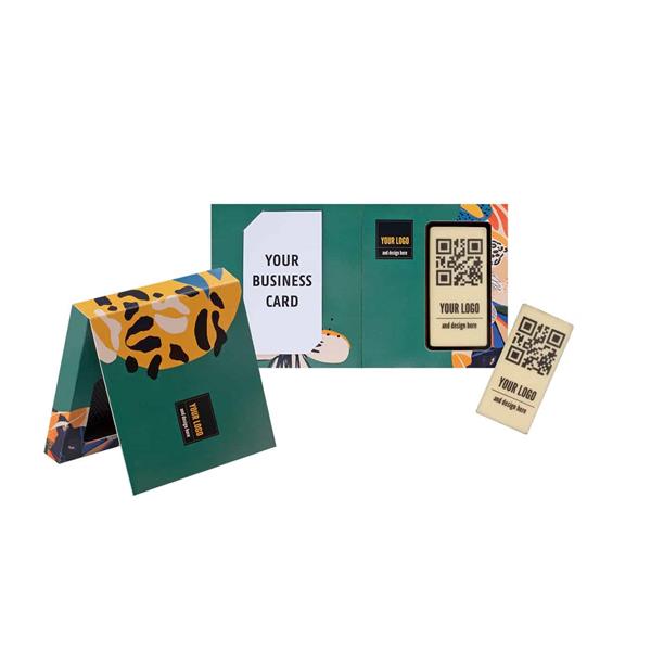 Czekoladowy kształt CHOCO4MAT MINI to wyjątkowy upominek biznesowy, który oferuje elegancję i smak białej czekolady (27% masła kakaowego). Produkt oferuje szerokie możliwości personalizacji – zarówno opakowania, jak i samej czekolady, na której można umieścić dowolną grafikę. Do wyboru są różne rodzaje papieru: biały w standardzie oraz ekologiczne opcje – papier kraft i ecru z dodatkiem włókien trawy. Produkt został zaprojektowany z myślą o środowisku, dlatego wypraska wykonana jest z R-PET, czyli materiału pochodzącego z recyklingu.