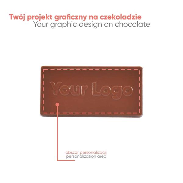 Czekoladowy kształt Choco4Mat Mini to wyjątkowy produkt, który oferuje smak wysokiej jakości czekolady oraz funkcjonalność kartki z kalendarza z miejscem na wizytówkę. Waga 30 g oraz szeroka gama smaków — od białej czekolady, przez deserową o różnej zawartości kakao, po czekoladę rubinową czy wersję bez cukru — pozwala na dopasowanie produktu do indywidualnych preferencji. Opcje personalizacji opakowania i samej czekolady (tłoczenie) sprawiają, że jest to idealna propozycja na elegancki upominek biznesowy.