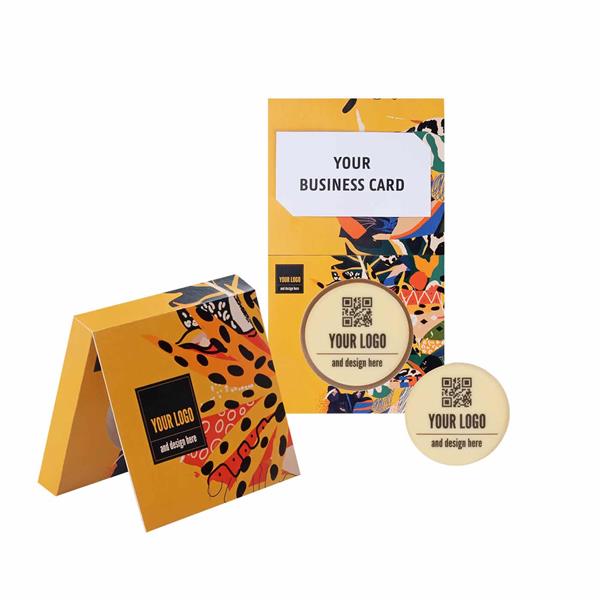 CZEKOLADOWY KSZTAŁT CHOCO4MAT MINI KOŁO PRINT Z WIZYTÓWKĄ to wyjątkowy produkt, który wyróżnia się smakiem i elegancją. Personalizowana biała czekolada o wadze 30 g, z 27% zawartością masła kakaowego, doskonale sprawdzi się jako oryginalny upominek biznesowy. Opakowanie dostępne jest w trzech wariantach papieru: biały standardowy, kraft oraz ecru z dodatkiem włókien trawy, co podkreśla ekologiczny charakter produktu. Dodatkowe atuty tego produktu to: opakowanie zawierające miejsce na wizytówkę oraz możliwość nadruku personalizowanej grafiki bezpośrednio na czekoladzie. Wypraska wykonana jest z materiału R-PET pochodzącego z recyklingu, co potwierdza troskę o środowisko.