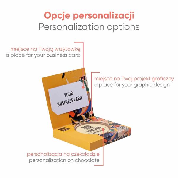 Produkt świetnie sprawdzi się podczas spotkań networkingowych oraz jako upominek dla partnerów biznesowych podczas jubileuszy firmowych. Elegancka forma i personalizacja czekolady pozwalają na skuteczne budowanie pozytywnego wizerunku marki, a ekologiczne materiały podkreślają odpowiedzialność społeczną firmy.