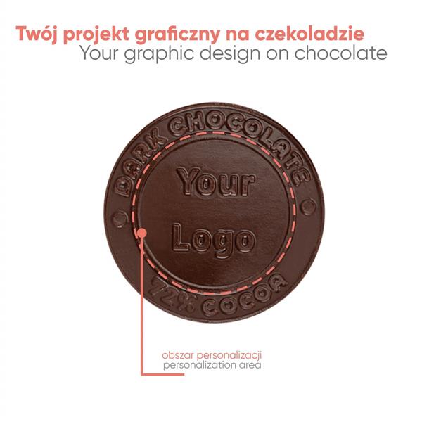 Czekoladowy medal z logo możemy wykonać w każdej z 10 kuwertur czekoladowych dostępnych w naszej ofercie.