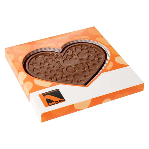 Czekolada kształtowa, umieszczona w wyprasce z R-PET (czyli PET pochodzący w 80% z recyklingu) zamknięta jest w opakowaniu z papieru z certyfikatem FSC (do wyboru kolor: biały, kraft lub ecru -papier z dodatkiem włókien trawy). Pudełko z okienkiem pozwala pięknie wyeksponować czekoladę.