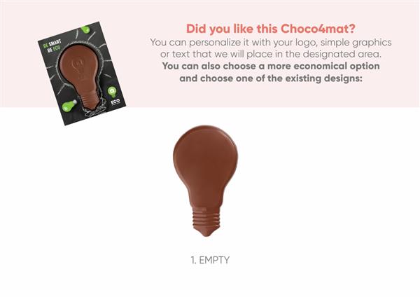 Czekolada kształtowa, umieszczona w wyprasce z R-PET (czyli PET pochodzący w 80% z recyklingu) zamknięta jest w opakowaniu z papieru z certyfikatem FSC (do wyboru kolor: biały, kraft lub ecru -papier z dodatkiem włókien trawy). Pudełko z okienkiem pozwala pięknie wyeksponować czekoladę.