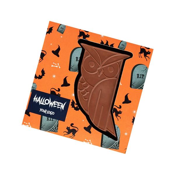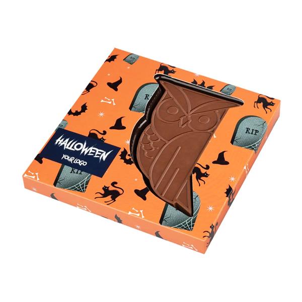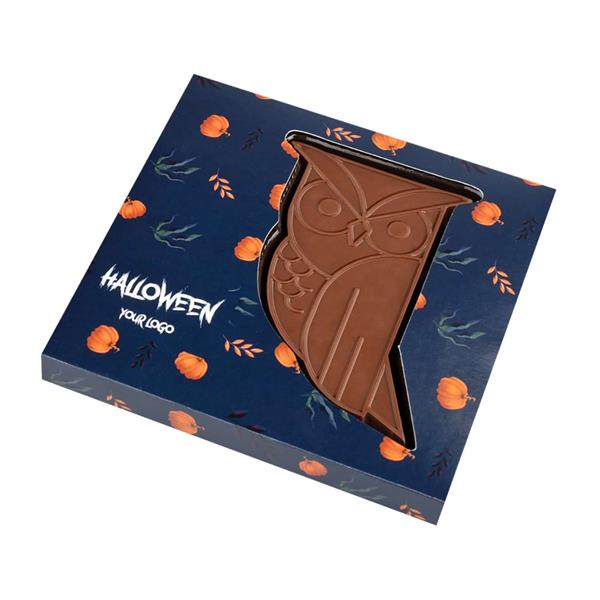 Tak piękny produkt wymaga odpowiedniej oprawy, dlatego zamknęliśmy czekoladową sowę w opakowaniu z okienkiem. Opakowanie zrobione z papieru z certyfikatem FSC, dostępne jest w 3 wariantach graficznych. Każda grafika została stworzona w nawiązaniu do stylistyki Halloween – zawiera więc obrazki duchów, dyni, czarnych kotów itp.
