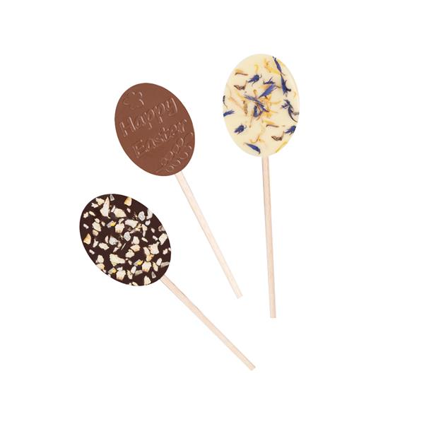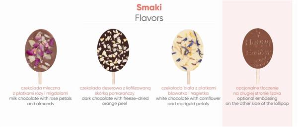 Czekoladowy Lizak Jajko Plus 25 g to doskonały pomysł na wielkanocny prezent firmowy, jest zaletami są: wyjątkowy smak i ekologiczne wartości. Lizak w kształcie jajka dostępny jest w trzech wyrafinowanych wariantach smakowych: białej czekolady, mlecznej z płatkami bławatka i nagietka, deserowej z liofilizowaną skórką pomarańczy oraz mlecznej z płatkami róży i migdałami. Dzięki naturalnym składnikom, produkt zachwyca nie tylko doskonałym smakiem, ale i czystym składem – bez oleju palmowego i sztucznych dodatków.