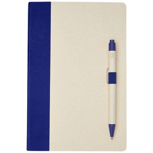 Zestaw z notatnikiem w formacie A5 i długopisem. Notatnik zawiera 80 kartek w linie (80 g/m2) wykonanych z poddanych recyklingowi kartonów po mleku (do 70%), grzbiet z kolorowego papieru i pętelkę na długopis. W pętelce na długopis znajduje się długopis na przycisk w dopasowanym do notatnika kolorze. Długopis ma korpus wykonany z tego samego materiału z kartonów mleka poddanych recyklingowi, a przycisk, klips i końcówka są wykonane z kolorowego tworzywa sztucznego PLA. W środku długopisu znajduje się czarny wkład. Zużyte kartony po mleku są zbierane, sortowane, przetwarzane i zamieniane w papier, co pozwala na przekształcenie odpadów w coś użytecznego.