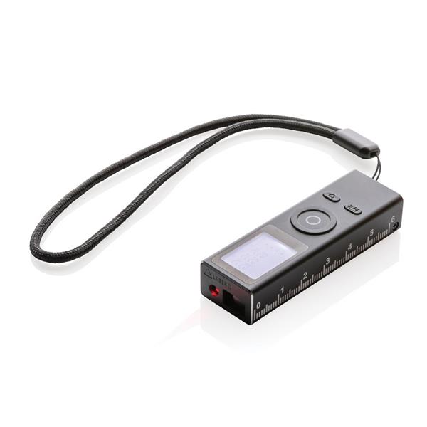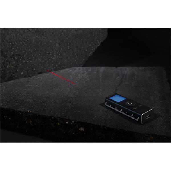 Dalmierz laserowy, zasięg pomiaru do 30 m, wykonany z aluminium z recyklingu, całkowita zawartość materiałów z recyklingu obliczona na podstawie wagi całkowitej przedmiotu: 22%, wbudowana bateria o pojemności 250 mAh, ładowanie przez USB, laser klasy 2, mierzy odległość, powierzchnię, objętość oraz przekątne, wejście USB typu C, ślad węglowy produktu: 0,63 kg CO2