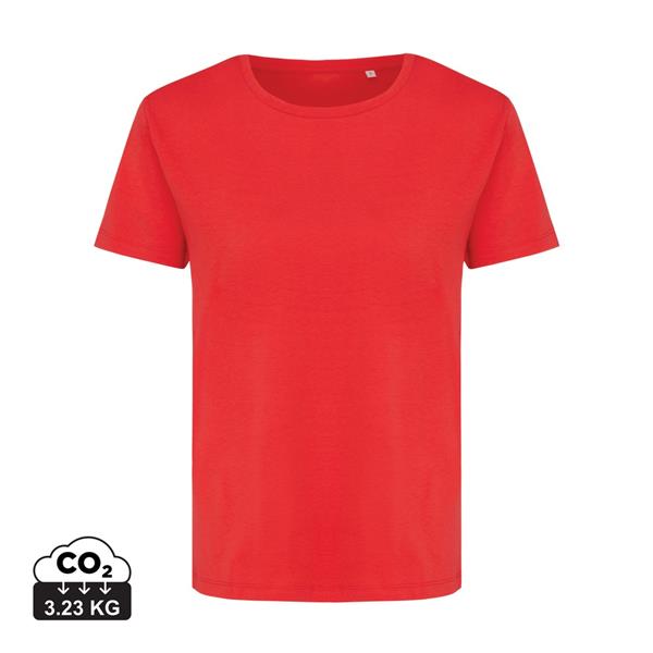 Koszulka damska, regularny krój, okrągły dekolt, krótkie rękawy, wykonana w 30% z bawełny z recyklingu i w 70% z bawełny organicznej o gramaturze 160 g/m2, posiada wbudowany znacznik AWARE™, który potwierdza wykorzystanie materiałów z recyklingu, posiada kod QR na metce, który prowadzi do cyfrowego paszportu produktu, 2% wpływów z każdego sprzedanego produktu z kolekcji Impact jest przekazywane na rzecz Water.org, ślad węglowy produktu: 3,23 kg CO2