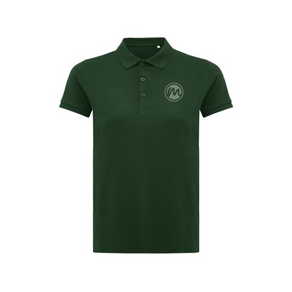 Koszulka polo, damska, zapięcie na 3 guziki, krój medium, splot Pique, krótkie rękawy, wykonana w 50% z bawełny z recyklingu i w 50% z bawełny organicznej o gramaturze 220 g/m2, bez dodatku poliestru, posiada wbudowany znacznik AWARE™, który potwierdza wykorzystanie materiałów z recyklingu, posiada kod QR na metce, który prowadzi do cyfrowego paszportu produktu, 2% wpływów z każdego sprzedanego produktu jest przekazywane na rzecz Water.org