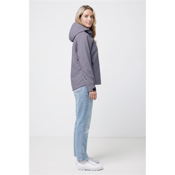 Damska kurtka softshell, wykonana z poliestru z recyklingu, 3 warstwowy materiał o gramaturze 300 g/m2, miękki polar wewnątrz, zapięcia mankietów na rzep, kaptur z regulacją, 2 kieszenie zamykane na zamek, wodoodporna dzięki zastosowanej technologii BIONIC-FINISH® ECO, wiatroszczelna i oddychająca konstrukcja, posiada certyfikat OEKO-TEX® STANDARD 100, posiada znacznik AWARE™, który gwarantuje, że wykorzystane materiały pochodzą z recyklingu, 2% wpływów z każdego sprzedanego produktu z kolekcji Impact jest przekazywane na rzecz Water.org, ślad węglowy produktu: 16,07 kg CO2