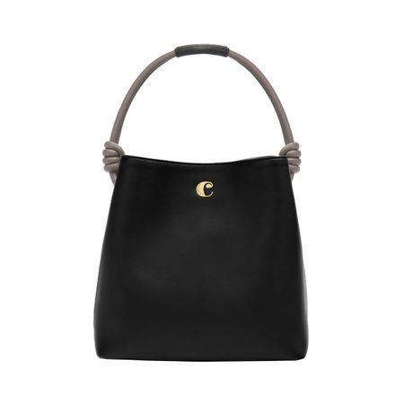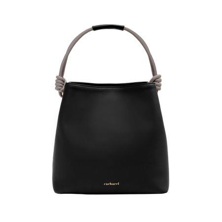 Czarna torba Apolline marki Cacharel wykonana jest z miękkiej, matowej, wysokiej jakości skóry wegańskiej (PU) i ma odważny design z kultowym logo `C` z przodu. Torba jest zaakcentowana uchwytem w kształcie węzła w kolorze ciemnoszarym, dodając charakterystyczny akcent do eleganckiej czarnej podstawy. Wszystkie wykończenia, w tym charakterystyczne logo `C` z przodu, są lekko pozłacane, co dodaje elegancji. Dodatkowo z tyłu znajduje się złoty podpis TPU Cacharel. Czarna torba Apolline oferuje funkcjonalne, a jednocześnie stylowe rozwiązanie do codziennego użytku, z przestronnym wnętrzem i wszechstronnym designem. Linia jest miękka, kolorowa i zabawna, bez wysiłku łącząc elegancję z nowoczesnym urokiem.