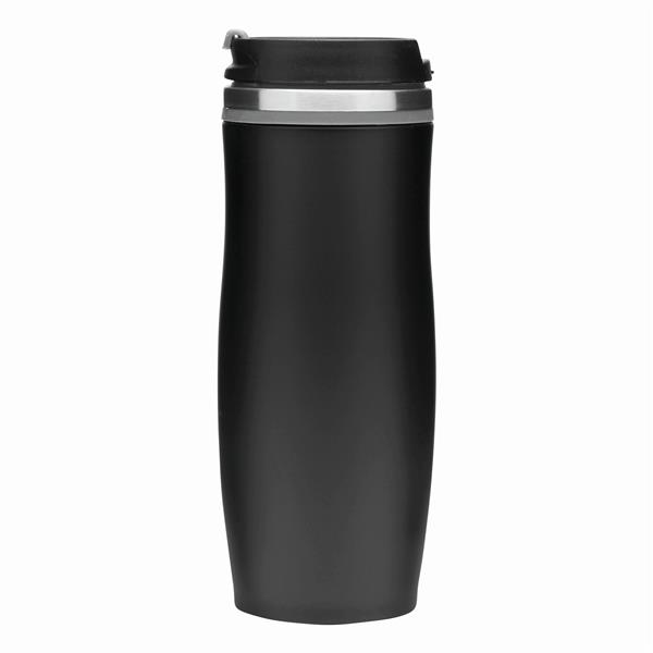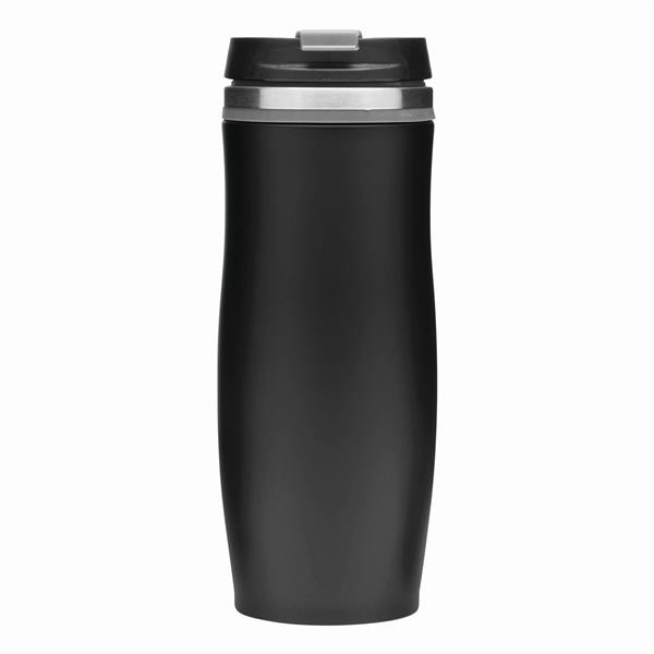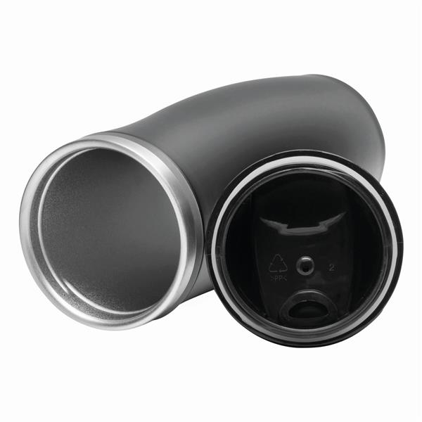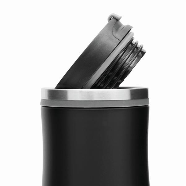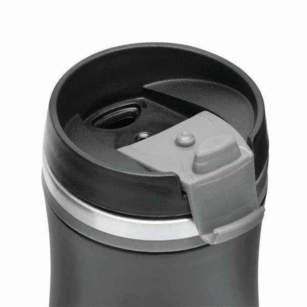 Kubek termiczny o podwójnych ściankach DARK CREMA. Wewnątrz i na zewnątrz stal nierdzewna. Odkręcana plastikowa pokrywa z wbudowanym, składanym otworem do picia, kolorowy gumowy pierścień wokół otworu i gumowany spód dla lepszej przyczepności, pojemność ok. 400 ml.